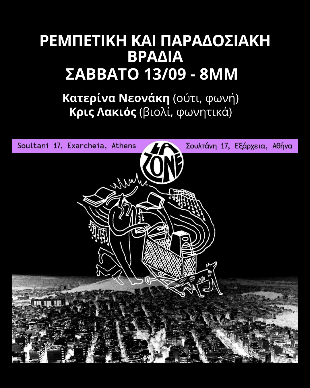 ΠΕΜΠΤΗ 9/10 ΣΤΙΣ 8MM, ELECTROKEBAB - LIVE ΣΤΟ LA ZONE (English below) Την επόμενη Πέμπτη θα έχουμε την χαρά να φιλοξενήσουμε τον Aydin (Electrokebab @electrokebab12), ένας μουσικός που πειραματίζεται αναμειγνύοντας την παραδοσιακή μουσική της Ανατολίας με διάφορα σύγχρονα στυλ. Παίζει κουρδικά, τουρκικά και ελληνικά τραγούδια, μαζί με μοναδικές προσωπικές συνθέσεις και αυτοσχεδιασμούς. Γεννήθηκε στη Σμύρνη, […]